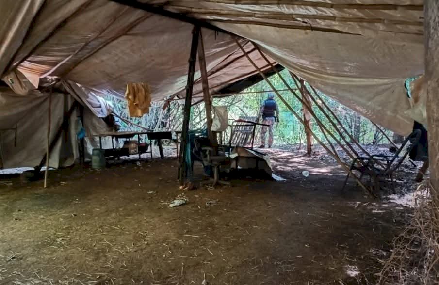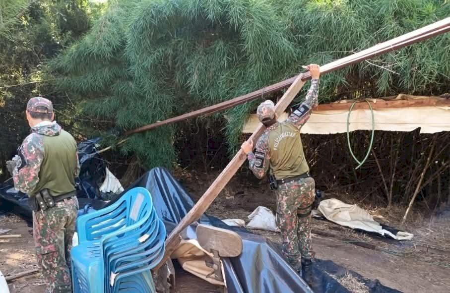 Dando continuidade às diligências, a guarnição localizou um acampamento fixo construído ilegalmente às margens do rio. A estrutura estava instalada em uma Área de Preservação Permanente (APP), zona protegida por lei para garantir a estabilidade das margens e a preservação da biodiversidade ribeirinha.