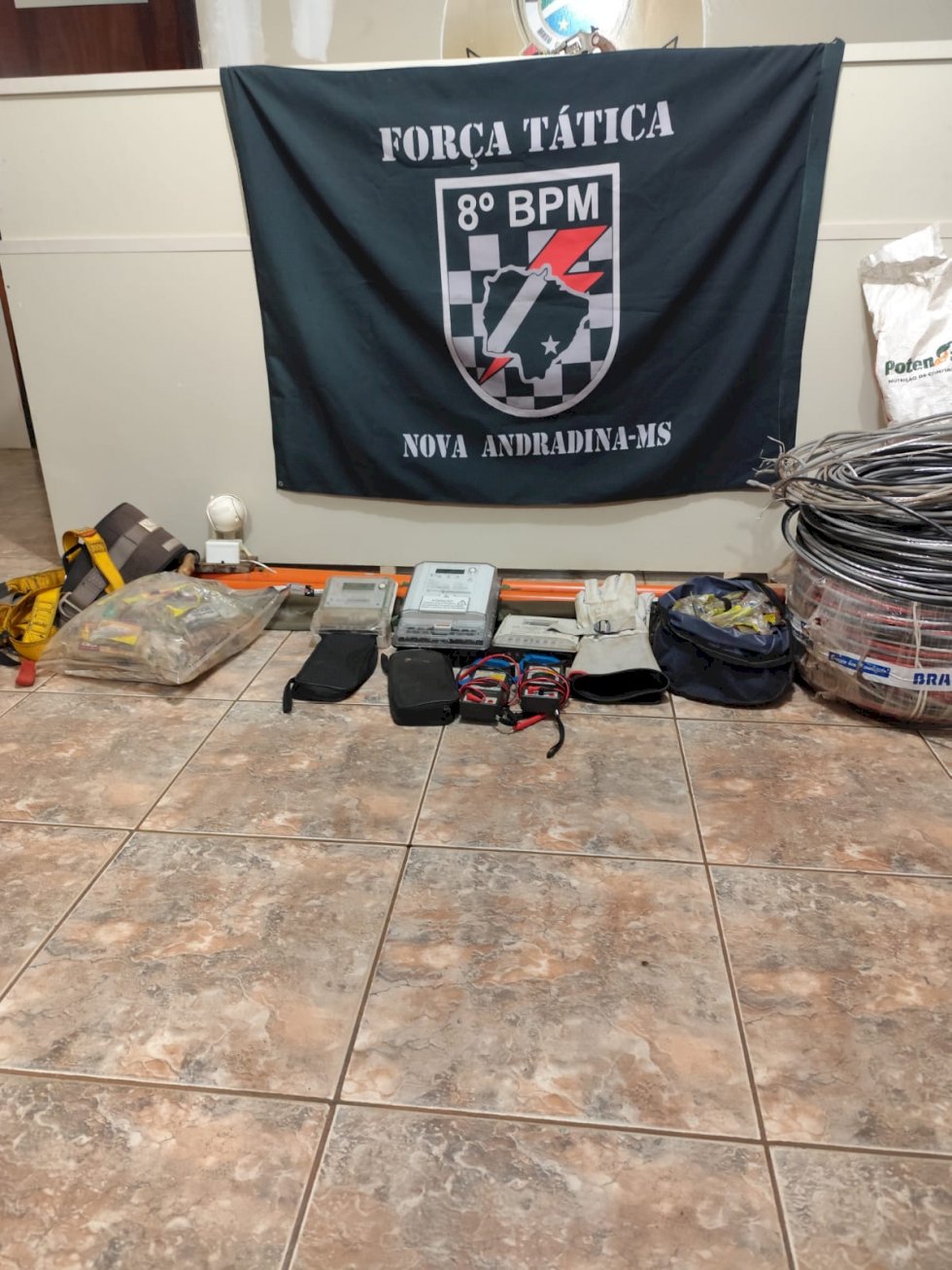 Questionado, o abordado alegou que os materiais seriam sobras de serviço. No entanto, representantes da concessionária de energia compareceram ao local e reconheceram os objetos como pertencentes à empresa. Durante a vistoria, também foi constatada a existência de uma câmera instalada em poste da rede elétrica com ligação irregular, caracterizando furto de energia.