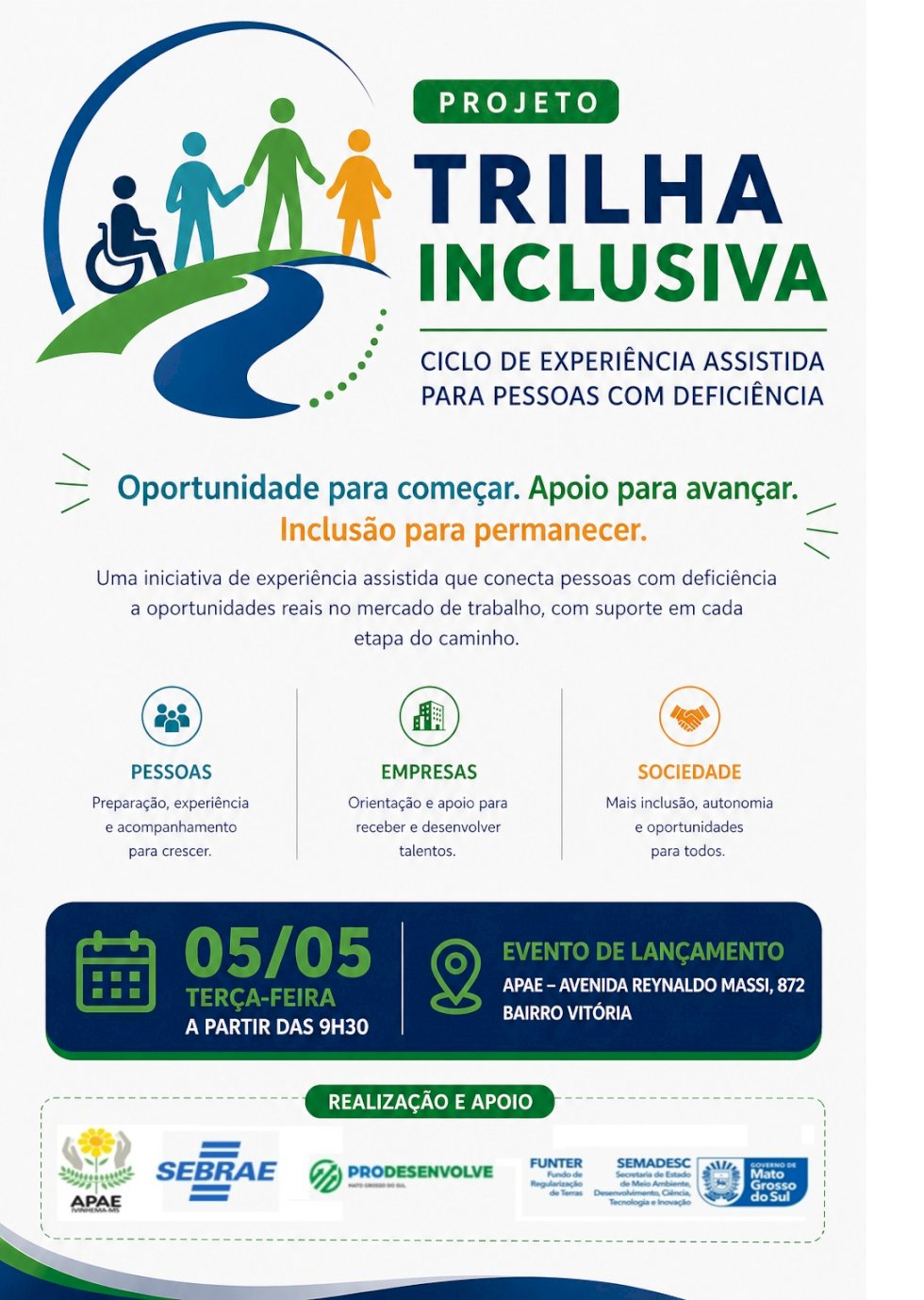 A APAE de Ivinhema dá mais um passo importante rumo à inclusão social ao anunciar o lançamento do Projeto Trilha Inclusiva, iniciativa voltada à promoção da empregabilidade de pessoas com deficiência.
