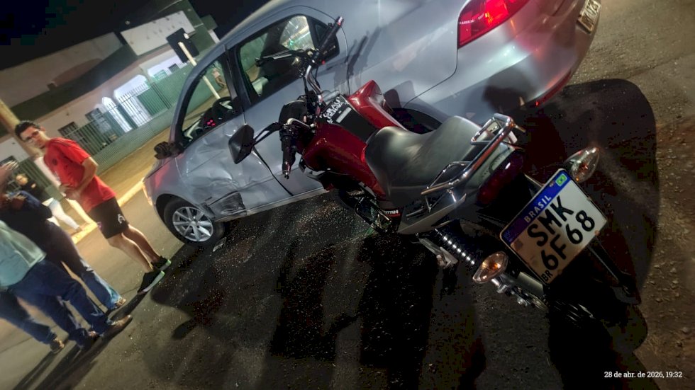 Um sinistro de trânsito envolvendo um carro e uma motocicleta foi registrado por volta das 19h30 desta terça-feira(28), na Avenida Brasil, esquina com a Avenida Arefa, em Ivinhema.