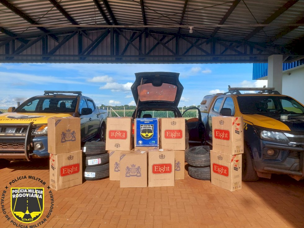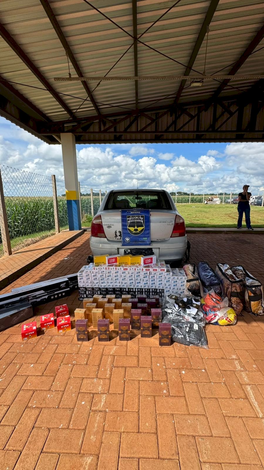 A segunda ocorrência ocorreu no mesmo dia, por volta das 13h15, no km 01 da MS-166, quando a equipe abordou um veículo GM/Celta. Durante a fiscalização, foram encontrados pacotes de cigarros e pneus de origem estrangeira, sem documentação fiscal. O condutor informou que havia adquirido os produtos no Paraguai e que realizaria o transporte até Campo Grande. Após contato com a Polícia Federal, a mercadoria e o veículo foram apreendidos, sendo o autor liberado.